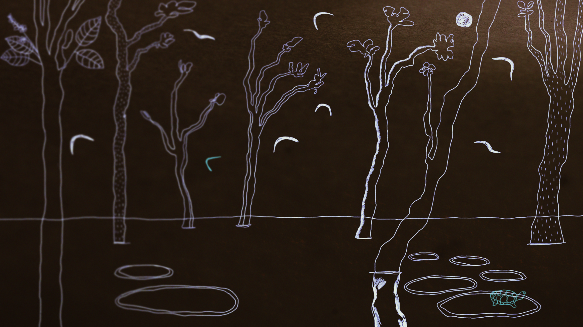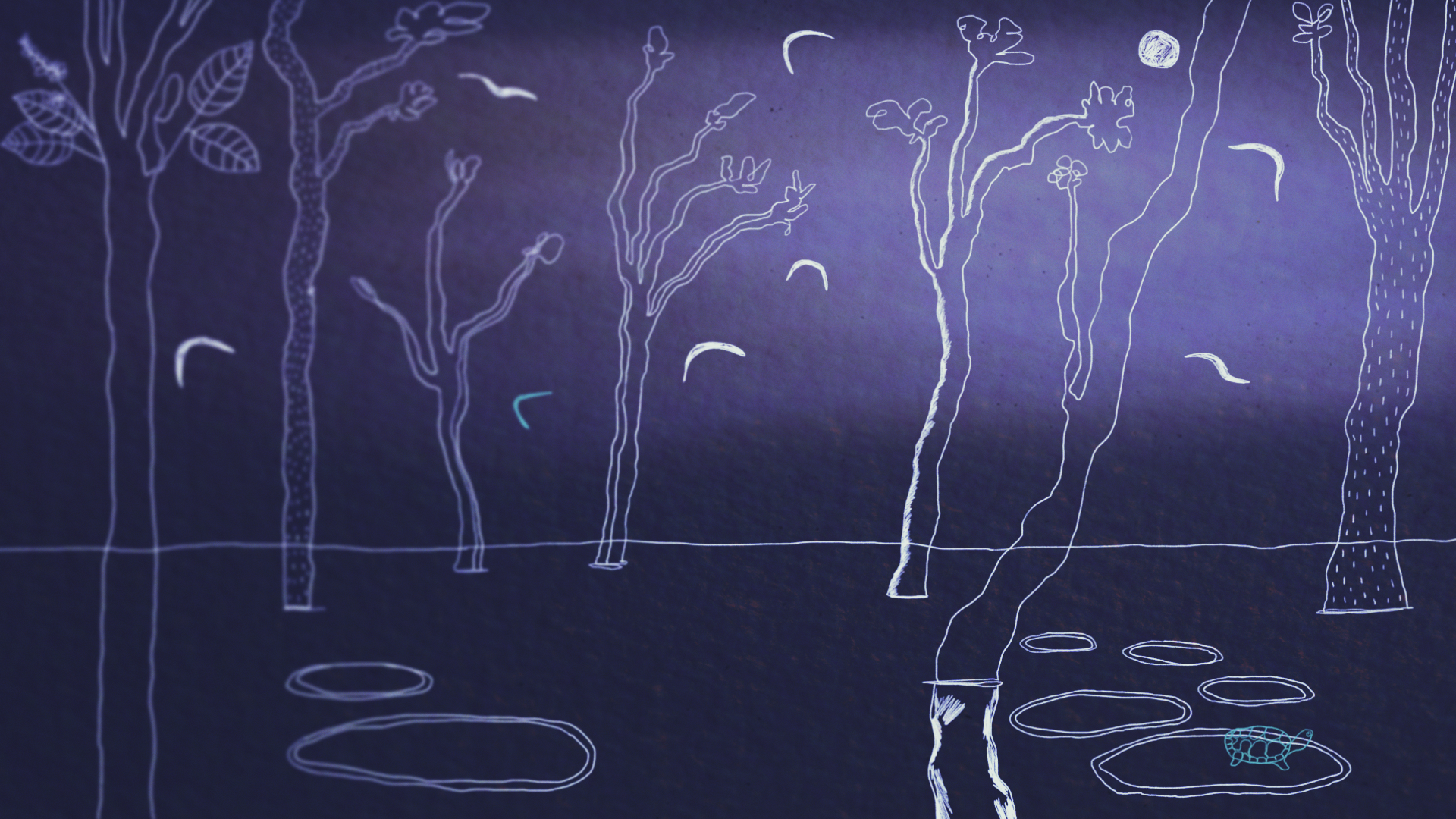 Uma cena noturna, com pássaros animados passando por entre as árvore.