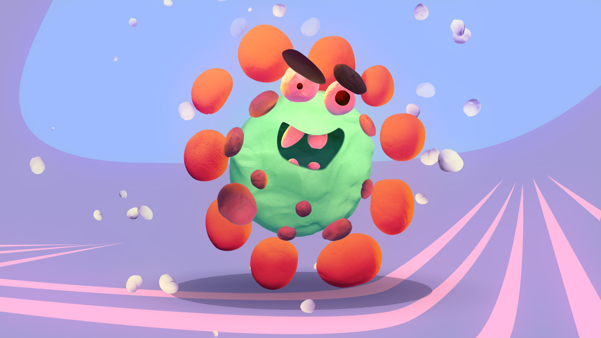 O VÍRUS está mais nervoso! Ele decide então tentar furar a barreira com uma britadeira. Agora sim, ele está conseguindo, então temos um zoom out que mostra que a barreira se tratava de uma máscara e ela é colocada dentro de um saco plástico e descartada no lixo.